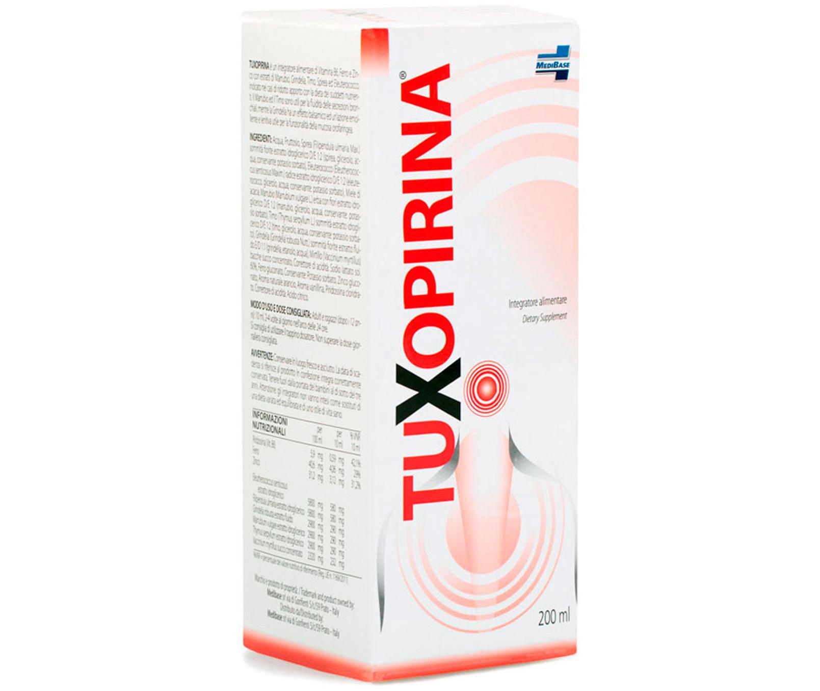 Tuxopirina® è un integratore alimentare di Vitamina B6, Ferro e Zinco con estratti fluidi di Marrubio, Grindelia, Timo, Spirea ed Eleuterococco.